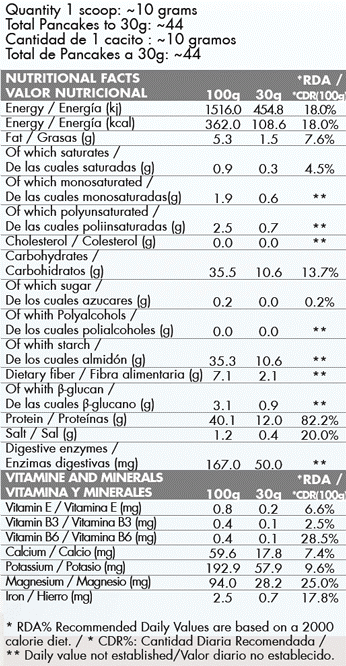 Sabor natural: Harina de avena integral, clara de huevo de gallina, enzimas digestivas (amilasa, proteasa, lactasa, lipasa, celulasa), sucralosa y Stevia.