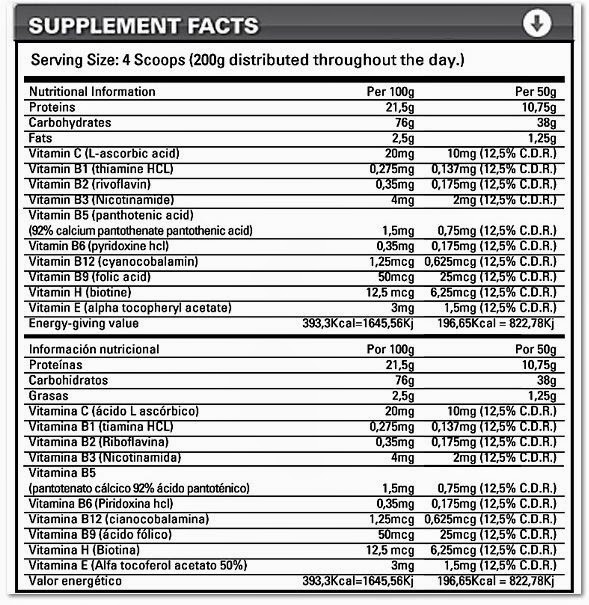 Se trata de una fórmula muy baja en grasas que tiene un alto contenido de hidratos de carbono (76%) y que a la vez contiene proteínas de calidad (20%) en la proporción adecuada para un aumento rápido de la masa muscular.