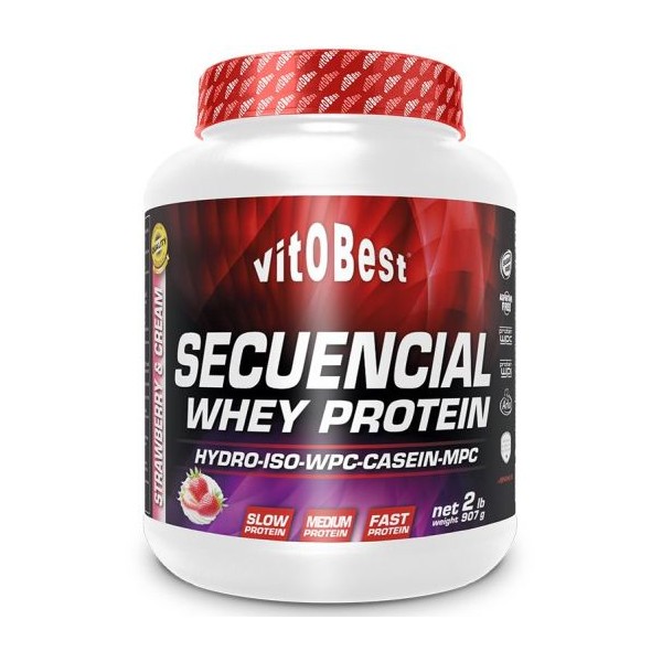Secuencial Whey Protein de Vitobest es un suplemento proteico en polvo que combina diferentes fuentes proteicas con distinta velocidad de digestión entre las que se incluye el concentrado de proteína de lactosuero instantáneo obtenido mediante ultramicrofiltración (WPC), la caseína micelar (Solmiko®), el aislado de proteína de suero (CFM®), el aislado de hidrolizado de proteína de suero (Thermax®) y enriquecida con L-glutamina.