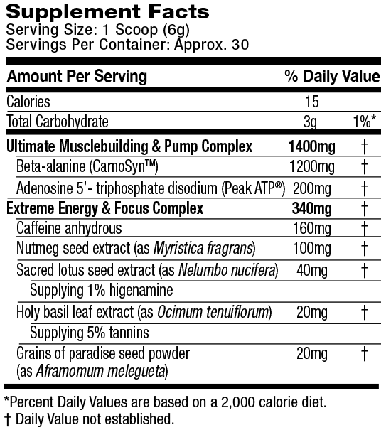 Complejo definitivo para bombeo y construcción muscular (beta alanina (Carnosyn™), Peak ATP disodio de adenosina 5-trifosfato), complejo extremo para energía y concentración (cafeína anhidra, nuez moscada silvestre (Myristica fragans), semillas y hojas de loto sagrado (Nelumbo nucifera), extracto de hoja de albahaca sagrada (como Ocimum tenuiflorum) con 5% de taninos, semilla de granos del paraíso en polvo (como Aframomum melegueta)).