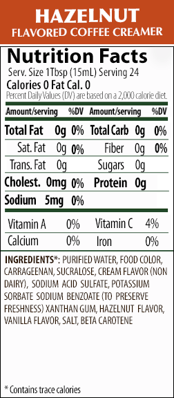 La crema de café Coffee Creamer Hazelnut es una deliciosa crema de café con sabor a avellana. La crema de café Coffee Creamer Hazelnut es una opción perfecta para aportar un delicioso sabor al café helado, a los batidos, al té, la leche o los cereales, también puedes añadirlas a múltiples recetas de cócteles o postres, ahorrándote un montón de calorías, sin incorporar grasas, azúcares ni carbohidratos.