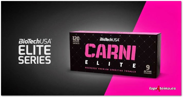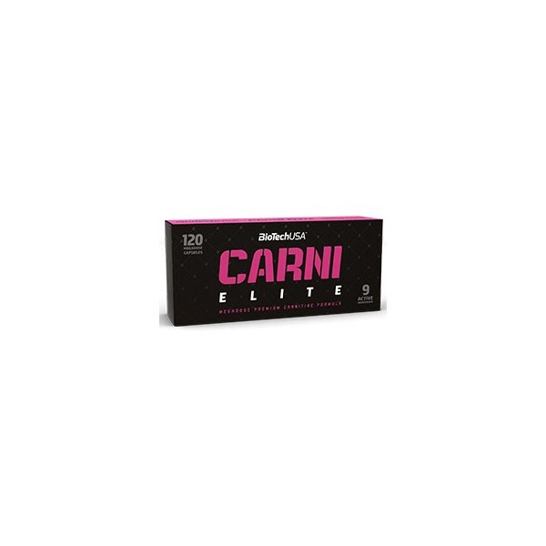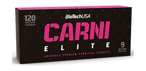 Carni Elite de BioTech USA dentro de su línea Elite Series destinada a atletas que buscan la excelencia en su nutrición deportiva, es una fórmula compleja que contiene una megadosis de 1500 mg de un complejo de L-carnitina que incluye L-carnitina, L-carnitina HCl, L-carnitina L-tartrato y acetil L-carnitina por dosis de 3 cápsulas y reforzada con CLA, HCA, niacia, Zinc y vitamina B5 para combatir el exceso de grasa sin estimular el sistema nervioso central.
