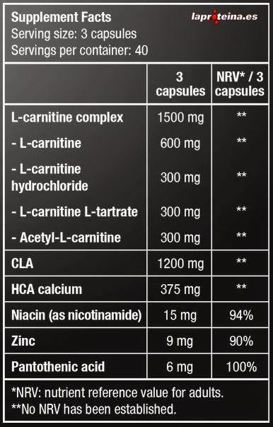 Megadosis de un complejo de carnitina (L-carnitina, L-carnitina HCl, L-carnitina L-tartrato y acetil L-carnitina) con 9 ingredientes activos.