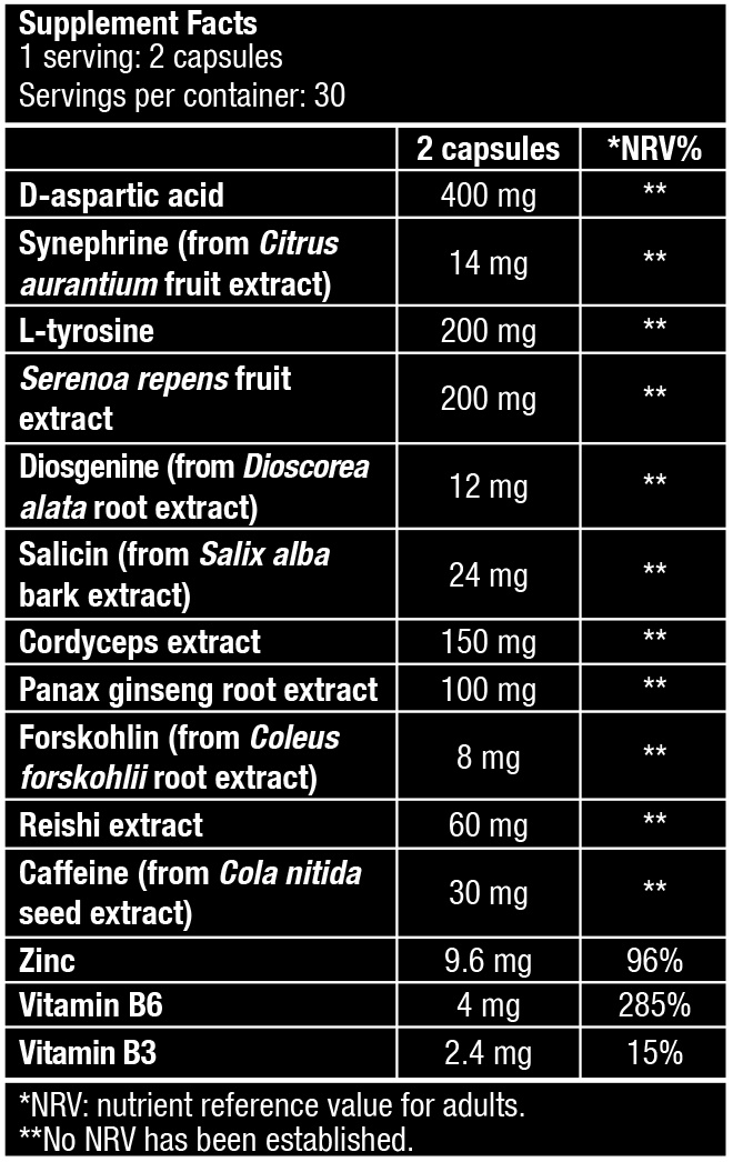 Ácido D-aspártico, extracto de fruto de Citrus aurantium, cubierta de la cápsula [gelatina, agua purificada, colorante (dióxido de titanio)], L-tirosina, extracto de fruto de Serenoa repens, extracto de raíz de Dioscorea alata, extracto de corteza de Salix alba, extracto de Cordyceps hyphostroma, extracto de raíz de Panax ginseng, extracto de raíz de Coleus forskohlii, extracto de cuerpo fructífero de Reishi, extracto de semilla de Cola nitida, citrato de zinc, antiaglomerantes (estearato de magnesio, dióxido de silicio), clorhidrato de piridoxina, ácido nicotínico.