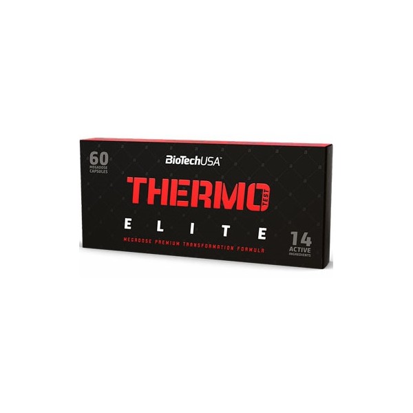 ThermoTest Elite de BioTech USA dentro de su línea Elite Series destinada a atletas que buscan la excelencia en su nutrición deportiva, es una novedosa fórmula que combina un complejo termogénico para la quema de grasa con un complejo potenciador de la testosterona que contiene una megadosis de 400 mg de ácido D-aspártico, 14 mg de sinefrina, 200 mg de tirosina, 200 mg de extracto de fruto de serenoa repens, 12 mg de diosgenina, 24 mg de salicina, 150 mg de extracto de cordiceps, 100 mg de extracto de raíz de ginseng panax, 8 mg de forskolina, 60 mg de extracto de reishi, 30 mg de cafeína, 9,6 mg de zinc, 4 mg de vitamina B6 y 2,4 mg de vitamina B3 por dosis de 2 cápsulas.
