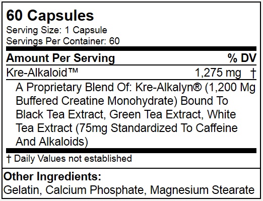 Kre-Alkaloid (Kre-Alkalyn® (monohidrato de creatina tamponada), Té Negro (Extracto de Té Negro), Té Verde (Extracto de Té Verde), Té Blanco (Extracto de Té Blanco), Gelatina, Fosfato de Calcio y estearato de Magnesio.