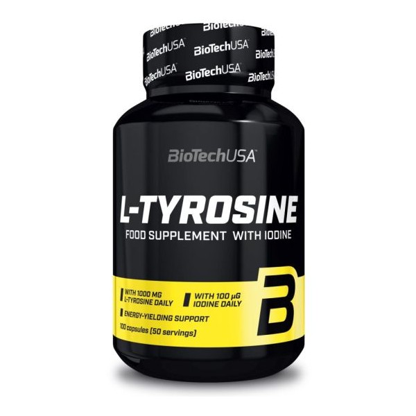 L-Tyrosine de BioTech USA es un suplemento en cápsulas que contiene 1.000 mg de L-tirosina por dosis de 2 cápsulas, potenciado con yodo para un mejor funcionamiento.