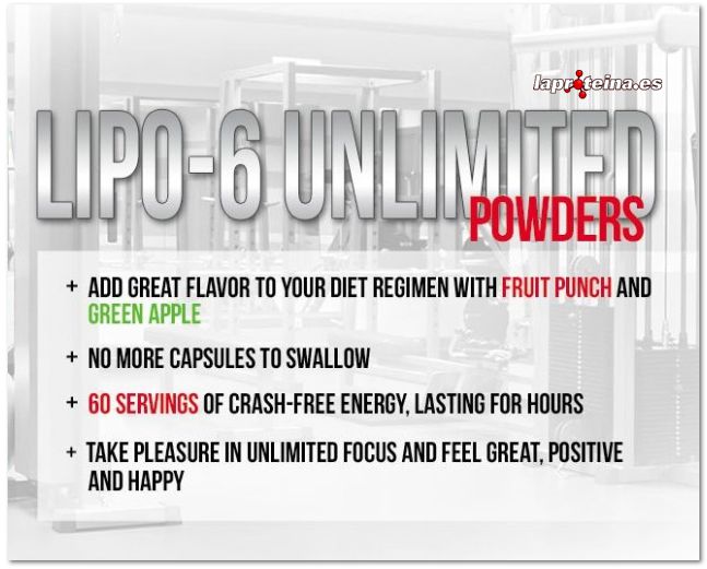 Lipo-6 Unlimited™ Powder ha sido diseñado para todos aquellas personas que se sienten estancados, aquellas personas que ya no consiguen perder grasa, o que están aburridos de sus entrenamientos y se sienten cansados, aquellas personas que en definitiva necesitan un nuevo empujón que les permita alcanzar un nuevo estado. A todos ellos, Lipo-6 Unlimited™ Powder les permitirá romper con su estancamiento.