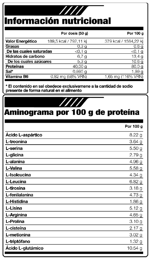 Su formulación incluye maltodextrina y la vitamina B6. La maltodextrina es un carbohidrato de asimilación lenta para mantener los niveles de glucosa en sangre de forma prolongada y contribuir a mantener la masa y el glucógeno muscular. Así mismo la vitamina B6 o piridoxina contribuye al metabolismo de las proteínas para favorecer el mantenimiento del músculo.
