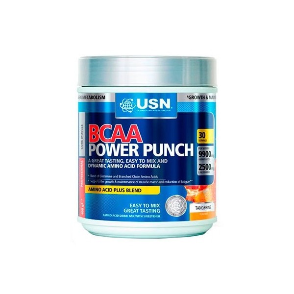 BCAA Power Punch de USN es una fórmula en polvo de aminoácidos de cadena ramificada diseñada para una rápida recuperación tras un entrenamiento intenso que ha sido potenciada con L-citrulina malato, L-Glutamina y potenciadores de la absorción.