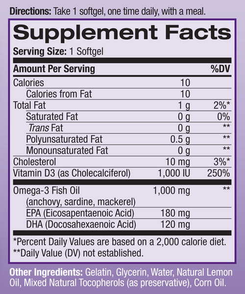 Fish Oil + Vitamin D3 contiene ácidos grasos Omega-3 son grasas no saturadas, conocidas popularmente como “grasas buenas”. Este tipo de grasa no puede ser sintetizada por el organismo, por lo que es esencial obtenerlas a través de la dieta.