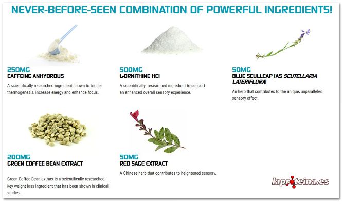 Clorhidrato de Lornitina, Cafeína anhidra, Extracto de grano de café verde (como Coffea canephora robusta), suministrando 45% de ácido clorogénico, extracto de hojas de té verde (Camellia sinensis) (estandarizado para EGCG), extracto de escutelaria azul (como Scutellaria lateriflora) (raíz), extracto de salvia roja (como Salvia miltiorrhiza) (raíz) (estandarizado para ácido salvianólico), extracto de raíz de jengibre (Zingiber officinale).