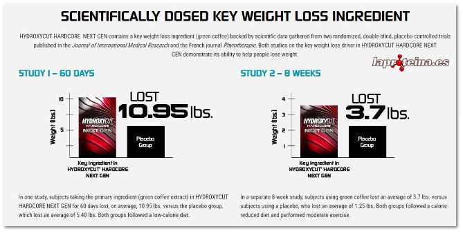 Asimismo, contiene café verde para obtener resultados de pérdida de peso realmente significativos. En el ámbito de un ensayo clínico, los individuos que ingirieron el ingrediente clave de Hydroxycut Hardcore® Next Gen (extracto de café verde [C. canephora robusta]) perdieron cerca de 5 kg en 60 días con ayuda de una dieta baja en calorías; e igualmente, consiguieron perder casi 1,7 kg en otro estudio de 8 semanas de duración, con una dieta hipocalórica y ejercicio físico moderado. La mayoría de las fórmulas termogénicas no cuentan con ningún estudio científico que respalde la eficacia de sus ingredientes clave para bajar de peso, y mucho menos dos.