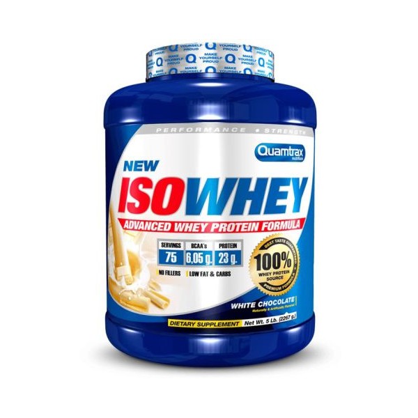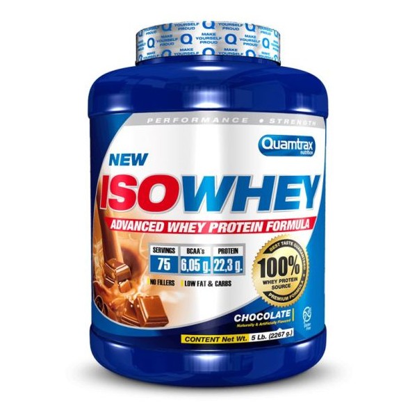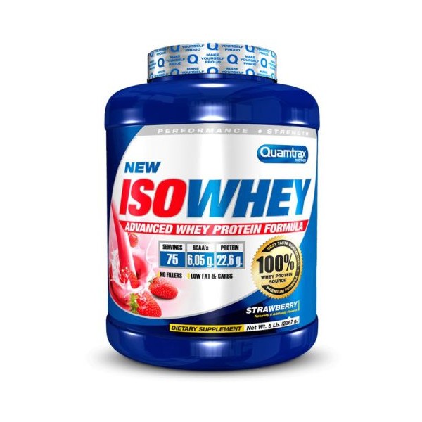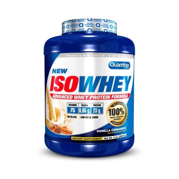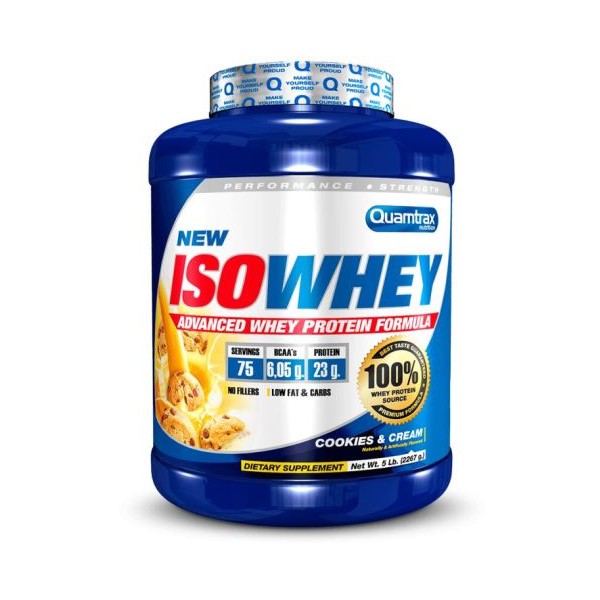 IsoWhey de Quamtrax Nutrition es un suplemento proteico en polvo que contiene una mezcla de aislado y concentrado de suero de leche obtenido por microfiltración de flujo cruzado, un proceso por el que se consigue una proteína que mantiene un valor biológico muy alto, pero con unas bajas concentraciones de lactosa, grasa y carbohidratos.