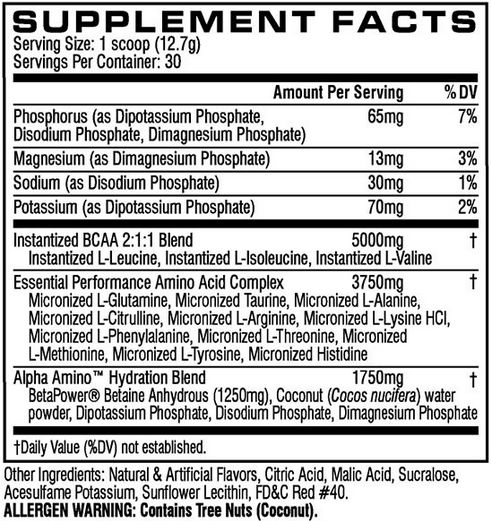 Instantanized BCAA 2:1:1 (L-Leucina instantánea, L-isoleucina instantánea, L-valina instantánea), Essential Performance Amino Acid (L-glutamina micronizada, Taurina micronizada, L-alanina micronizada, L-citrulina micronizada, L-arginina micronizada, L-lisina HCl micronizada, L-fenilalanina micronizada, L-treonina micronizada, L-metionina micronizada, L-tirosina micronizada, histidina micronizada), Alpha Amino™ Hydration Blend (BetaPower betaína anhidra, agua de coco (en polvo), fosfato dipotásico, fosfato disódico, fosfato dimagnésico.