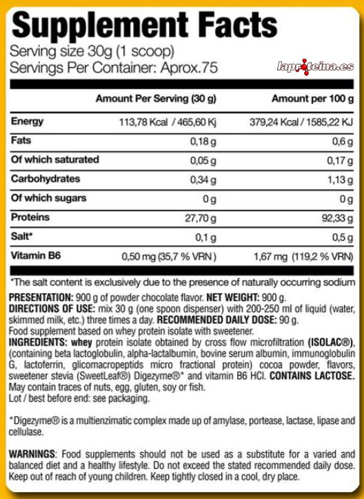Aislado de proteína de suero de leche obtenido por microfiltración de flujo cruzado Isolac®. Con Digezyme® y stevia SweetLeaf®.
