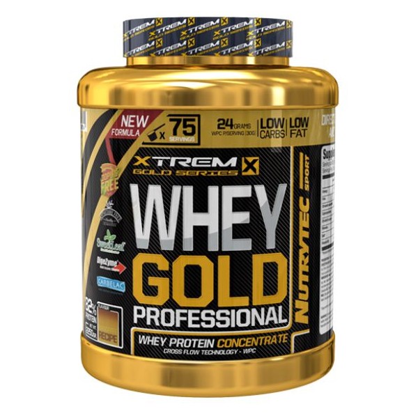 WHEYGold Professional de Nutrytex Xtrem dentro de su nueva línea Gold Series, es una fórmula proteica que contiene concentrado de proteína de suero de leche obtenido por ultrafiltración de flujo cruzado de Lactomin®, enriquecido con el complejo multi-enzimático Digezyme® y edulcorado con stevia SweetLeaf®.
