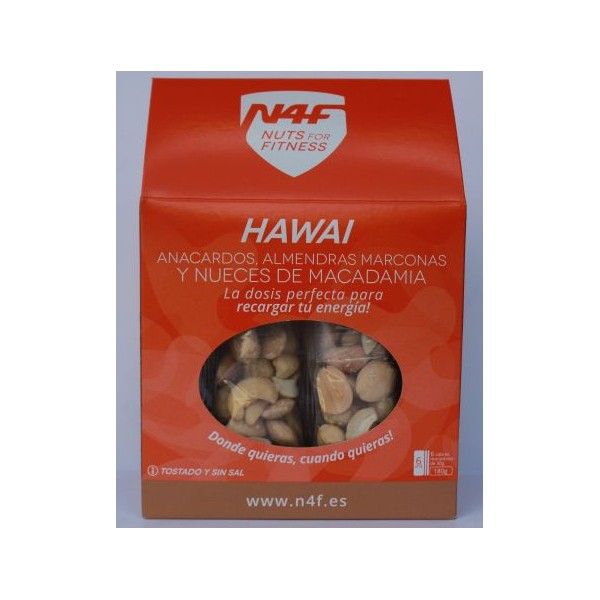 Snacks Hawai de Nuts4Fitness contiene 6 bolsas monodosis de 30 gramos de una mezcla de anacardos, almendras marconas y nueces de macadamia que constituyen la dosis perfecta para recargar tu energía. ¡Dónde quieras, cuándo quieras!