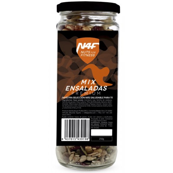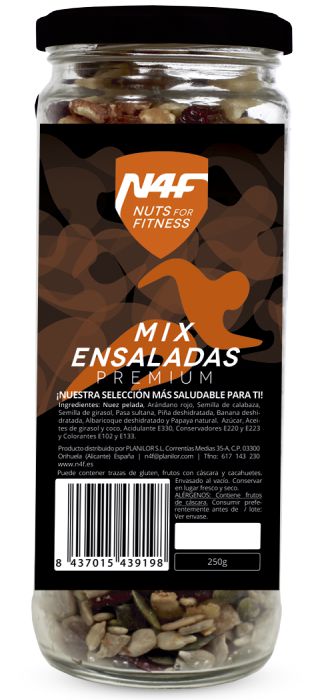 Mix Ensaladas Premium de Nuts4Fitness contiene 250 gramos de un combinado de nueces peladas, arándanos rojos, semilla de calabaza, semilla de girasol, pasa sultana, piña deshidratada, banana deshidratada y albaricoque deshidratado envasados al vacío, que resulta perfecto para cualquier persona que quiera mantener una dieta equilibrada y variada.