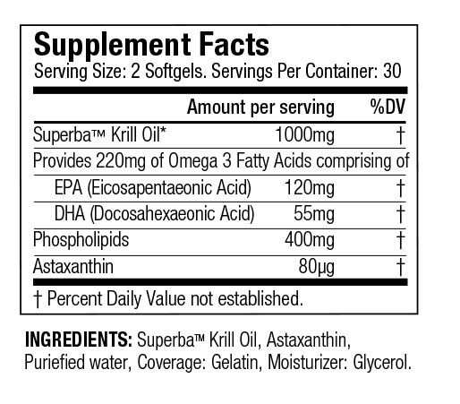 Krill Oil Superba™ de StarLabs contiene 500 mg por perla de aceite Superba™ Krill de origen Noruego y de la calidad más alta disponible en el mercado, una fuente rica de fosfolípidos únicos, axtasantina, omega 9 y DHA.