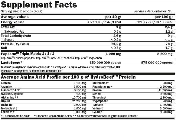 HydroBeef™ Peptide Protein contiene exclusivamente como fuente de proteína HydroBEEF™ 100% original, un producto producido en Suecia por Proliant Health Inc., que consiste en una fórmula exclusiva de péptidos elaborada con ternera Europea mediante hidrólisis en diferentes pasos, que contiene una mezcla especial de aminoácidos y péptidos pre-digeridos de varias medidas moleculares.