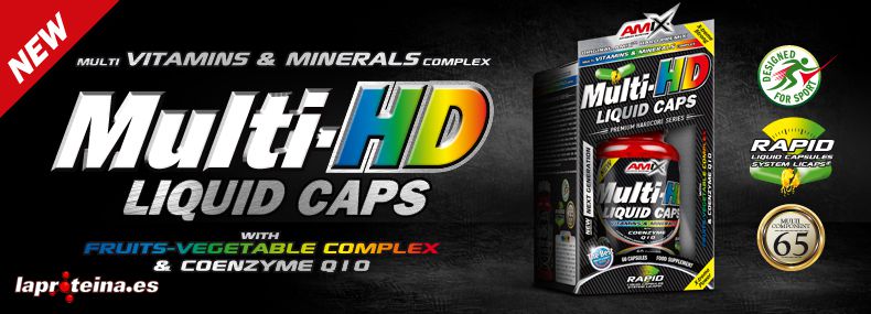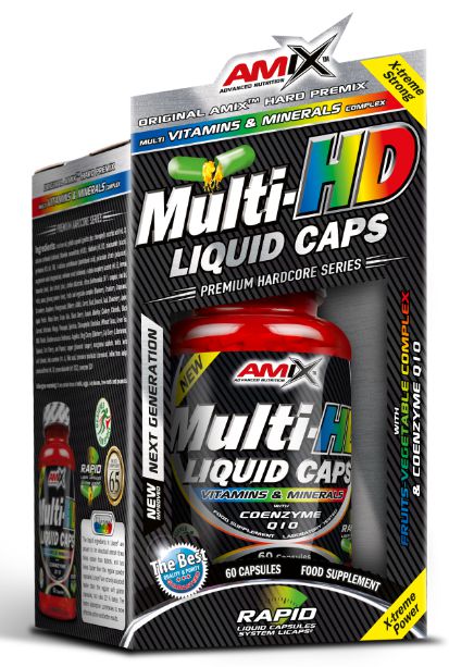 Multi-HD Liquid Caps de la marca nº1 en Europa Amix™ Nutrition, es producto de cápsulas rellenas de líquido compuesto por un amplio espectro de vitaminas y minerales, enriquecido con un complejo de frutas y vegetales junto a otros ingredientes tales como la coenzima Q10, colina, bioflavonoides cítricos, inositol y ginseng entre otros.