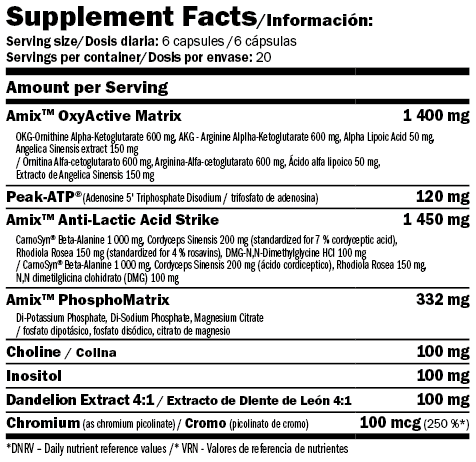 Contiene una matriz denominada "Amix OxyActive Matrix" que incluye OKG-Ornitina Alfa-Cetoglutarato, AKG-Arginina Alfa-Cetoglutarato, Ácido alfa lipoico y extracto de Angelica Sinensis.