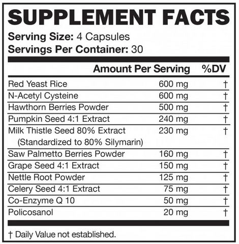 Arroz de levadura roja, NAC, extracto de la baya del espino (2% de ácido cratagico y 5% de glicósidos flavonoides), extracto de semilla de calabaza, extracto de cardo de leche (80% de silimarina), extracto de Saw Palmetto, extracto de semilla de uva, raíz de ortiga, extracto de semilla de apio, coenzima Q10, policosanol Plus® (alcoholes alifáticos, ácidos grasos saturados y ácidos grasos poliinsaturados).
