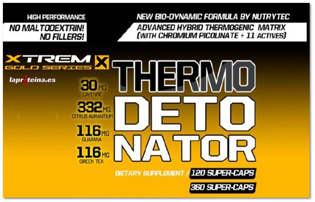 Thermo Detonator de Nutrytex Xtrem dentro de su nueva línea Gold Series, es una potente fórmula termogénica de acción múltiple que contiene hasta 16 ingredientes termogénicos naturales con efecto sinérgico para conseguir una importante pérdida de grasa sin poner en peligro nuestro tamaño muscular.
