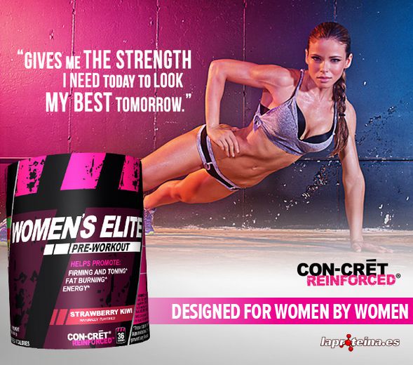 Women´s Elite de Con-Cret de la marca ProMera Sports es un suplemento de pre-entrenamiento fortificado con vitaminas diseñado especialmente para mujeres deportistas, a las que proporcionará una energía funcional, con el propósito de quemar más calorías durante el entrenamiento, a la vez que actua como un supesor del apetito y mejora el bienestar general.
