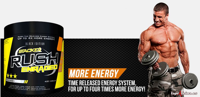 Rush Enraged es uno de los pocos suplementos disponibles que ha conseguido justamente eso. Gracias a su excelente combinación de estimulantes naturales de absorción rápida, mediana y lenta, Rush Enraged te proporciona una energía que va liberándose poco a poco durante toda tu sesión de entrenamiento. La energía y la concentración te durarán hasta 4 veces más. Un aporte de energía fabulosamente duradero con el que podrás realizar entrenamientos más duros que hasta ahora. Cuando hayas vivido esta sensación por primera vez, ya no volverás a entrenar sin Rush Enraged.