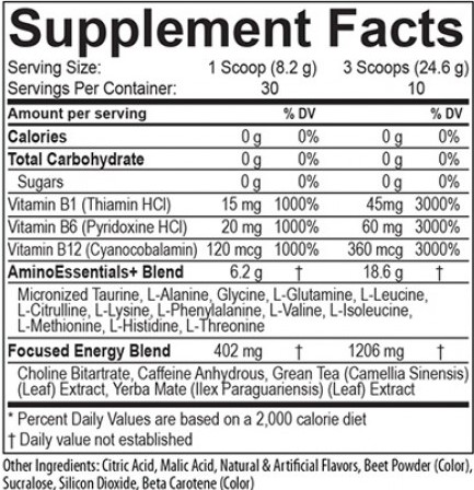 Taurina Micronizada, L-Alanina, Glicina, L-Glutamina, L-Leucina, L-Citrulina, L-Lisina, L-Fenilalanina, L-Valina, L-Isoleucina, L-Metionina, L-Histidina, L-Treonina, Colina Bitartrato, Cafeína Anhidra, extracto de hoja de Té Verde (Camelia Sinensis) y extracto de hoja de Yerba Mate (ILex Paraguariensis), Vitamina B1 (Clorhidrato de Tiamina), Vitamina B6 (Hidrocloruro de Piridoxina), Vitamina B12 (cianocobalamina).