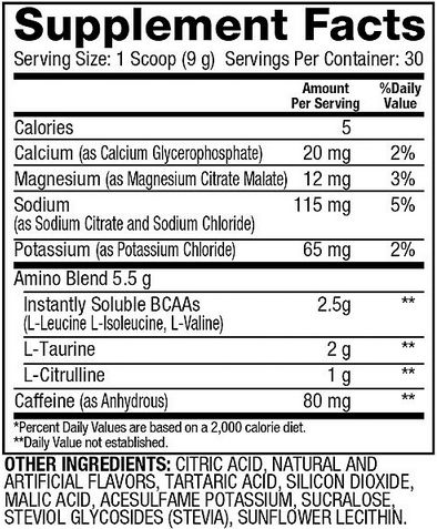 Calcio (como glicerofosfato de calcio), Magnesio (como magnesio citrato malato), Sodio (como citrato de sodio y cloruro de sodio), Potasio (cloruro de potasio), Cafeína (como cafeína anhidra), Mezcla de aminoácidos: Mezcla de BCAA (L-leucina, L-valina y L-isoleucina), L-taurina, L-citrulina, cafeína (anhidra).