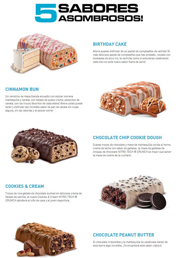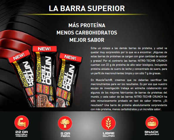 Nitro-Tech™ Crunch combina una experiencia de sabor única con unas características nutricionales de la mayor calidad, ya que proporcionan 22 gramos de proteína, 5 gramos fibra y están libres de gluten.