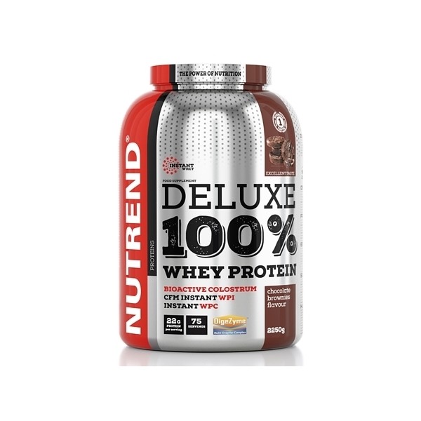 Deluxe 100% Whey Protein de Nutrend® es un suplemento de alta calidad que contiene una mezcla proteica exclusiva compuesta por concentrado y aislado de proteína de suero, que ha sido enriquecida con calostro rico en compuestos bioactivos que le otorgan unas características y cualidades únicas, fortaleciendo el sistema inmunológico y promoviendo el desarrollo de la masa muscular.