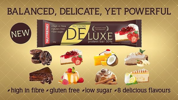 Deluxe Protein Bar de Nutrend® son unas deliciosas barritas de 60 gramos con un 30% de proteína, altas en fibra, bajas en azúcar y libres de gluten.