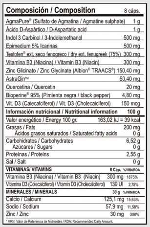 AgmaPure® (sulfato de agmatina), ácido D-aspártico, Indol 3 Carbinol, Epimedium 5% icarinas, Testofen® extracto seco fenogreco (75% fenusides) (Trigonella foenum-graecum L.), Vitamina B3 (niacina), zinc glicinato (Albion® TRAACS®), AstraGin™, Quercetina, Bioperine™ 95% (pimienta negra), vitamina D3 (colecalciferol).