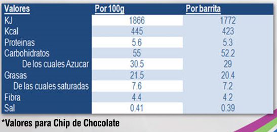 Avena (35%), cobertura de chocolate 21 % (azúcar, aceite de palma, cacao en polvo bajo en grasa, suero de leche en polvo, emulgente: lecitina de soja y aroma) sirope golden, margarina vegetal (aceite de palma y colza, agua, sal, aroma natural), azúcar de caña, frutos secos de Brasil (5%). Alérgenos: contiene gluten, leche, frutos de cáscara y soja. Puede contener trazas de huevo, cacahuetes, y semillas de sésamo.