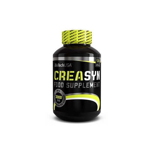 CreaSyn de BioTech USA es un suplemento en cápsulas para antes del entrenamiento que contiene una matriz de 2 clases de creatina junto con otros 7 ingredientes para ayudarte a mejorar el rendimiento durante el entrenamiento.