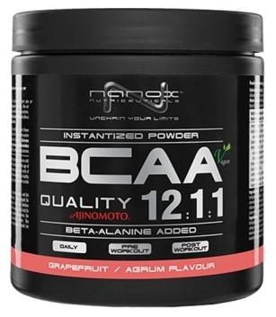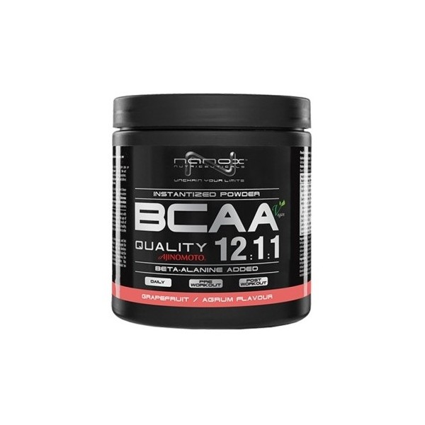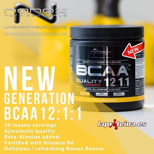 BCAA 12:1:1 Ajinomoto de Nanox™ Nutriceuticals es un suplemento nutricional en polvo que contiene aminoácidos de cadena ramificada en una proporción 12:1:1 entre leucina, valina e isoleucina reforzados con beta alanina, y que ha sido específicamente formulado para aquellos deportistas que buscan una estimulación extra de expansión de masa corporal y el crecimiento muscular extra, exigiendo un proceso de estímulo anabólico continuo e intensivo.