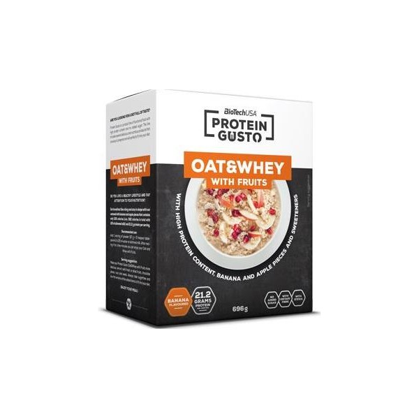 Oat & Whey with Fruits de BioTech USA dentro de su línea de comidas funcionales Protein Gusto es un producto que contiene una combinación de copos de avena y trozos de fruta con una mezcla de proteína de concentrado de suero y aminoácidos (BCAAs, glutamina y arginina), en dos versiones diferentes, una con sabor a chocolate con trozos de cereza y otra con sabor a plátano con trozos de plátano y manzana.
