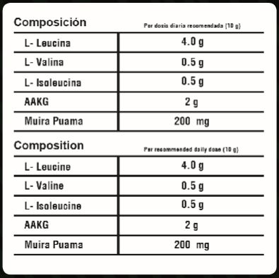 Cada servicio de 10 gramos proporciona 5 gramos de BCAAs, 2 gramos de arginina alfa cetoglutarato y 200 mg de extracto seco de Muira Puama.