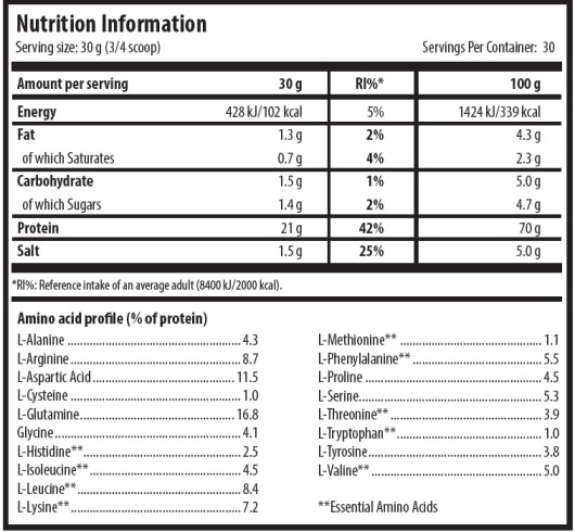 También contiene una alta concentración de glutamina, lisina y BCAAs, y por tanto es parecida a la proteína de suero aunque con una cantidad más relevante de arginina que la del suero.