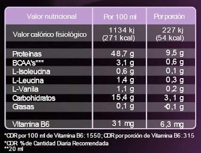 Agua potable, proteína hidrolizada (50.2 %), fructosa, ácido cítrico acidulante y ácido tártico,, sabor, azúcar melaza de remolacha, preservativo benzoato de sodio, ciclamato de sodio endulzante, acesulfamo K, Aspartamo*, y sacarina- sódica, Vitamina B6 (Piroxidina Clorhidrato) (0, 038%), colorante E124