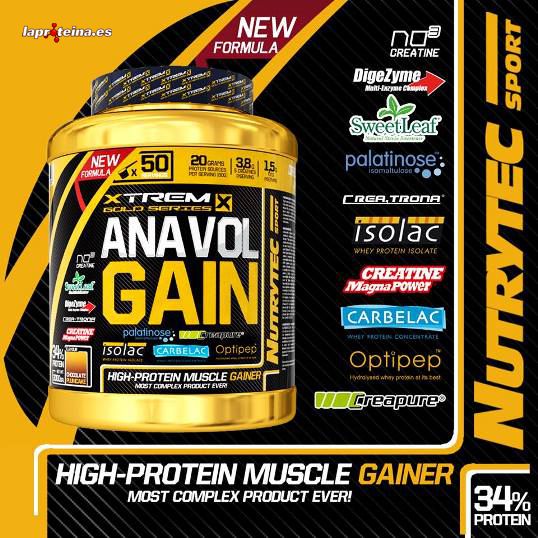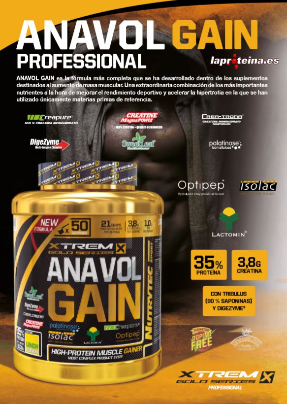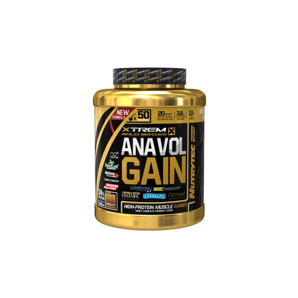 Anavol Gain de Nutrytex Xtrem dentro de su nueva línea Gold Series, es el ganador de peso alto en proteína más completo del mercado que contiene una combinación de carbohidratos con proteínas de alta calidad, todo ello potenciado con una matriz de creatinas, potenciadores del óxido nítrico, potenciadores anabólicos, aminoácidos recuperadores, vitaminas, minerales, el complejo multi-enzimático Digezyme® y edulcorado con stevia SweetLeaf®.