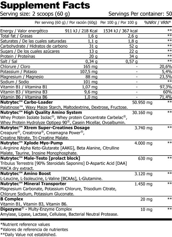 Sabor vainilla: Carbo-loader (Palatinose™, almidón de maíz modificado, maltodextrina, dextrosa, fructosa), Nutrytec™ High Quality Amino System (Aislado de proteína de suero Isolac®, concentrado de proteína de suero Carbelac®, hidrolizado de proteína de suero Optipep 90®, caseína micelar, ovoalbúmina), Xtrem Super-Creatines Dosage (Creapure® (100% creatina monohidrato), creatrona® (creatina monohidrato tamponada), Creatina Magna Power® (100% creatina quelato de magnesio), creatina nitrato, tri-creatina malato), Xplode Myo-Pump (L-Arginina Alfa Keto-Glutarato [AAKG], beta alanina, citrulina malato, taurina, inosina monofosfate), Male-Testo [prolact block] (extracto seco de Tribulus Terrestris [90% Steroideals Saponins] ácido D-Aspártico DAA] extracto seco de maca (Lepidium meyenii), Amino Boost (L-Leucina, L-Isoleucina, L-Valina [BCAAs], L-Glutamina), aromas, Mineral Transporter (Carbonato de magnesio, cloruro potásico, citrato trisódico, cloruro de sodio, gluconato potásico), B Complex (Vitamina B3 (nicotinamida), vitamina B1 HCl, vitamina B6 HCl), DigeZyme™ - Multy-Enzyme Complex (Amilasa, lipasa, lactasa, celulasa, proteasa neutra bacteriana, edulcorantes (estevia Pure Cyrcle®, E-955 y E950).
