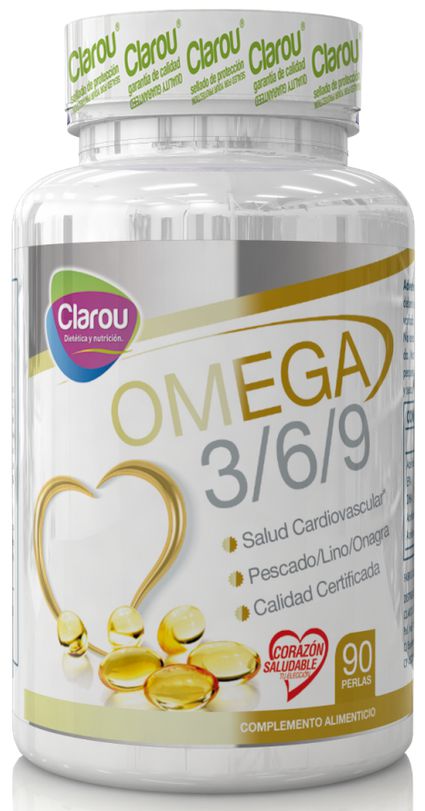 Omega 3-6-9 de Clarou es un suplemento en perlas que te proporciona 800 mg de aceite de pescado (EPA/DHA: 144/96 mg), 800 mg de aceite de semilla de lino y 400 mg de aceite de onagra por servicio de 2 perlas.