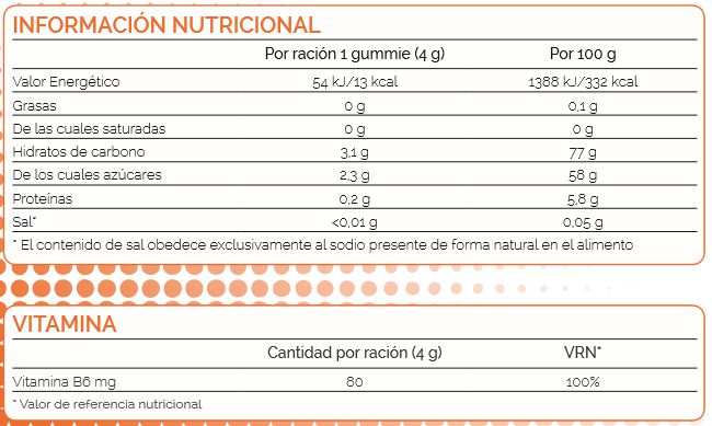 Azúcar, jarabe de glucosa, agua, gelatina, dextrosa, vitamina C (ácido L-ascórbico), esencia de naranja, sorbitol, acidulante (E-330), agente de recubrimiento (CAPOL: aceite de coco, cera de carnauba y cera de abeja) y colorante (E-120).