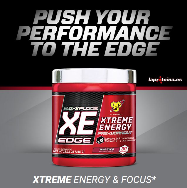 N.O.-Xplode XE Edge de BSN Finish First es el nuevo pre-entreno concentrado diseñado para ayudarte a mejorar el rendimiento durante el entrenamiento gracias a una mezcla energética que contiene compuestos botánicos muy potentes junto con una alta dosis de beta alanina y citrulina.