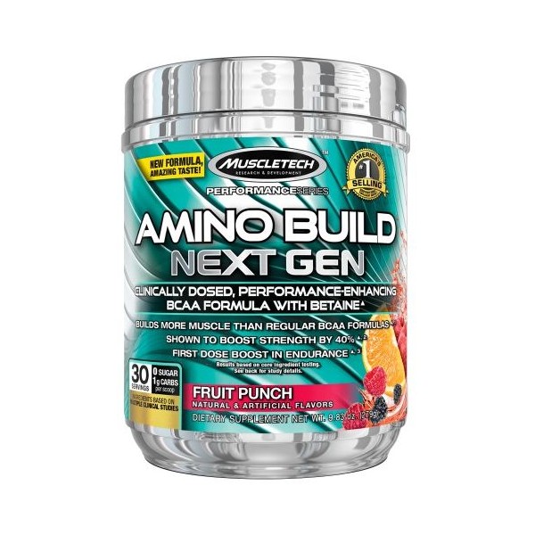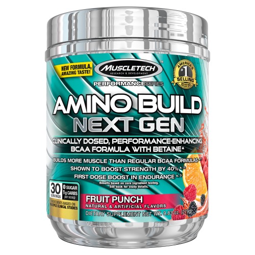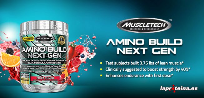 Amino Build™ Next Gen es la nueva fórmula de Muscletech que contiene un complejo de calidad superior para antes y durante el entrenamiento, que suministra una extraordinaria dosis (en 2 cazos) de 8 gramos de una matriz de 100% BCAAs en forma libre y en la proporción 2:1:1 que ayuda a abastecer los músculos esqueléticos, preservar las reservas de glucógeno muscular y reducir la degradación proteica.
